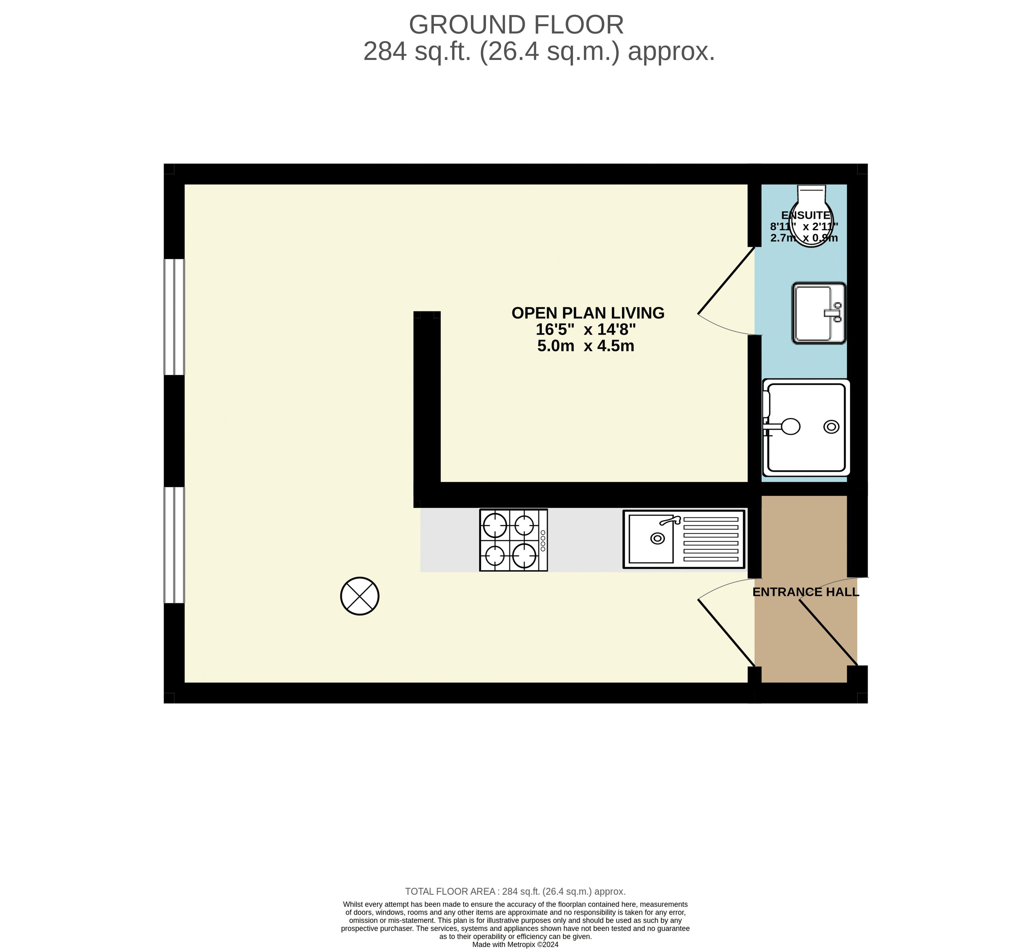 The accommodation briefly comprises open plan lounge area and fitted kitchen (with appliances), double bedroom and en-suite shower room. The property also benefits from central heating, double glazing, communal courtyard and communal laundry facilities